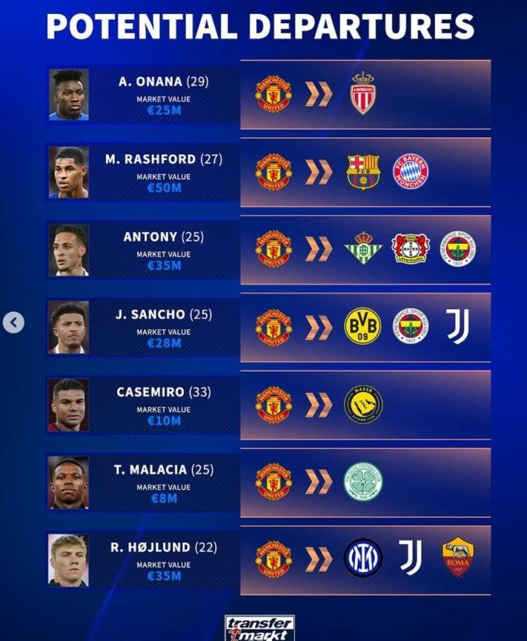 德转列曼联潜在离队球员及身价:(欧元)