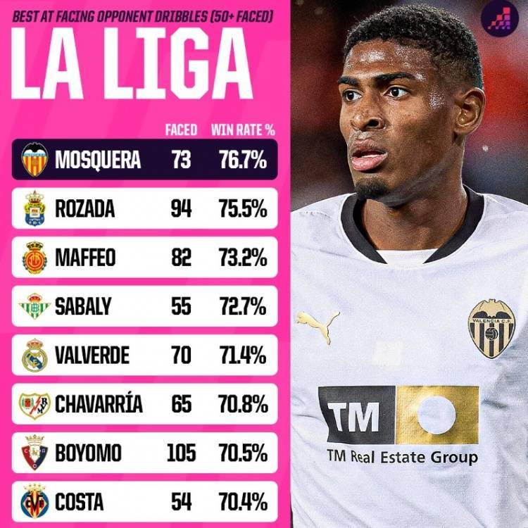 Opta指出,莫斯克拉是西甲阻止对手过人成功率最高的球员,对手73次尝试过掉他,其中76.7%的过人被他阻止,在尝试阻止对手过人次数50+的西甲球员中,他的成功率最高。